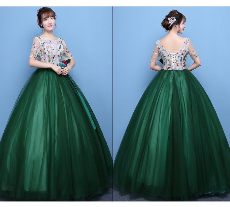 This time, when they come out, the dress is much less of a risk, but it certainly keeps the more natural look, with vines and leaves seeming to curl up around the bust and arms. It's another one the girl looks quite happy in, and she spins quickly to show it off. It drops quite sharply at the back, but it's still quite acceptable for the function.]