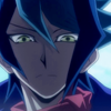 Shun's figure is a little difficult to fully discern in the darkness given the colours he prefers to wear, but his eyes are very visible, as is the slightly reflective surface of some kind of gem on a bracelet that sticks out from under his coat sleeve.]