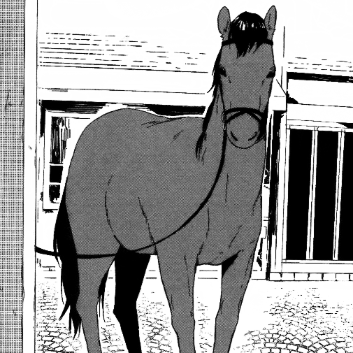 [ He's staring at that weird horse, with the weird name. Without even breaking contact with it, ]